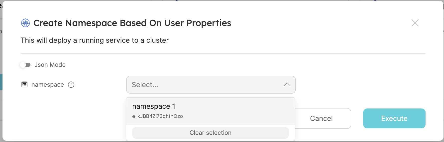 In this example, we will create an action that lets the user select a cluster and a namespace in that cluster. The user will also be able to select a service that is already running in the cluster. The action will then deploy the selected service to the selected namespace in the cluster. The user will only be able to select a service that is linked to his team.