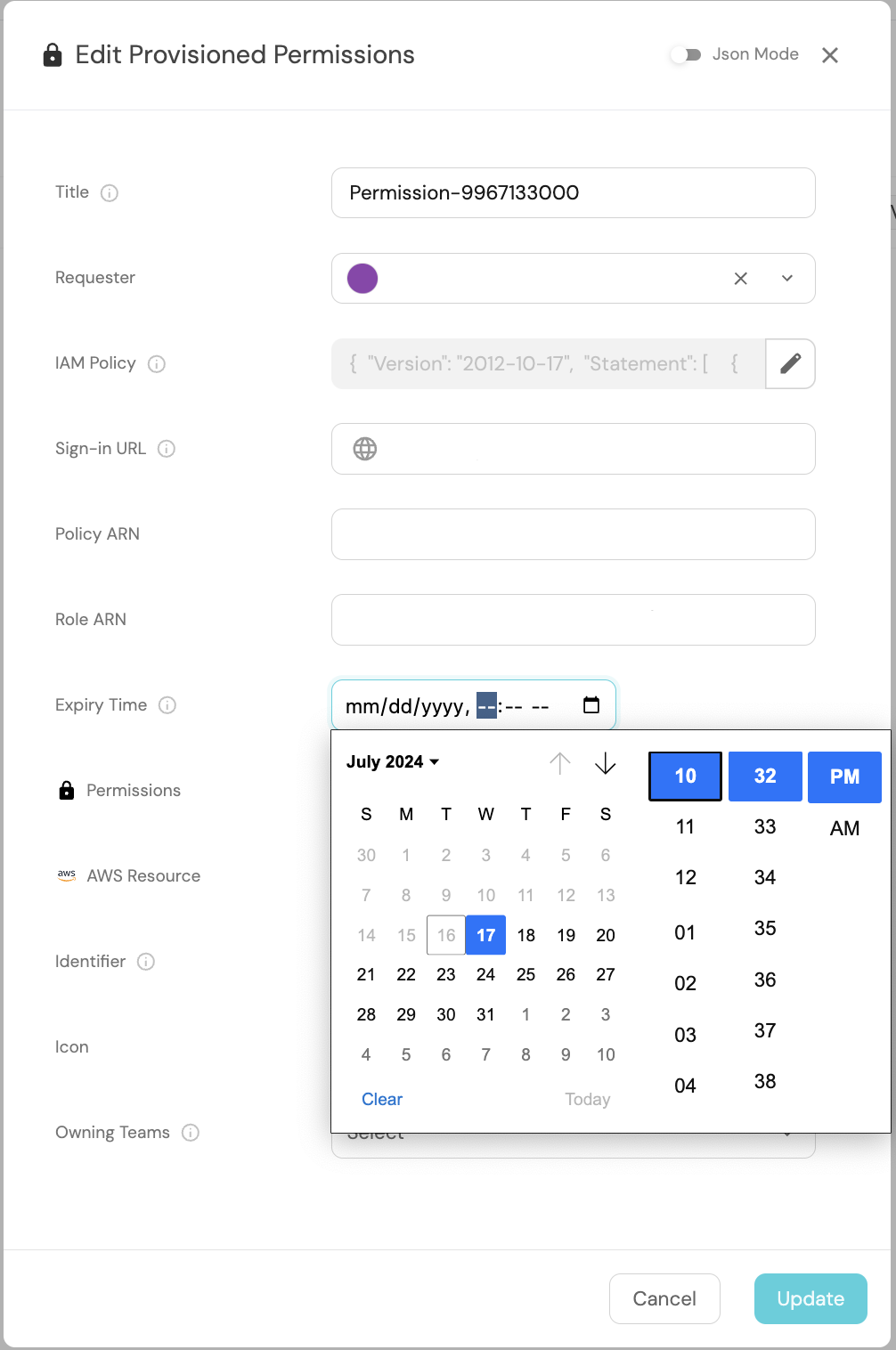 Once our automation is deployed, we will manually configure the expiry time for a provisioned permission through the Port UI. In a real-world scenario, this would typically be programmatically set based on your organization's permissions time-to-live policy or defined by the developer during the permission creation via self-service action.