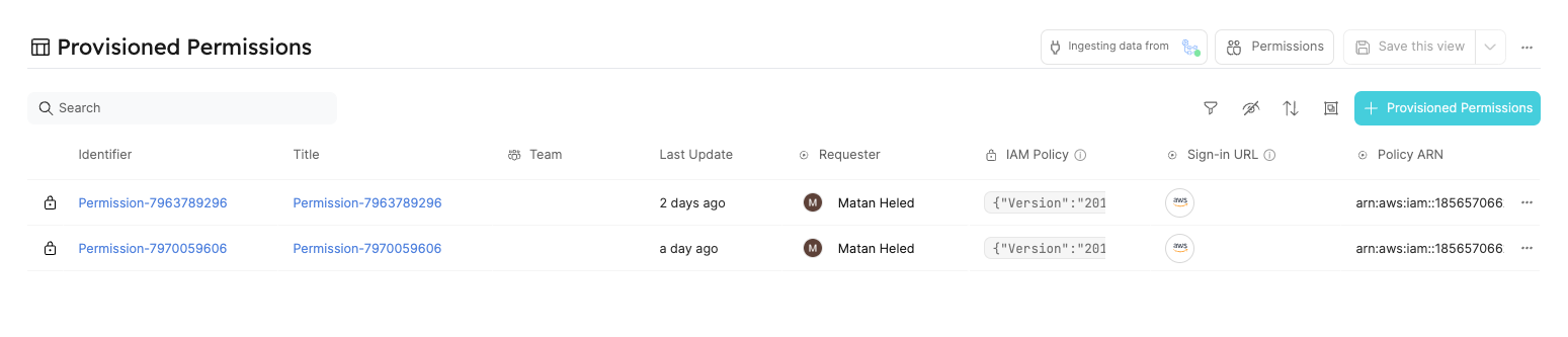 Visit the Provisioned Permissions catalog page to view all active permissions. There, you can find detailed information, including the requesters of permissions, IAM policies, sign-in URLs, and more.