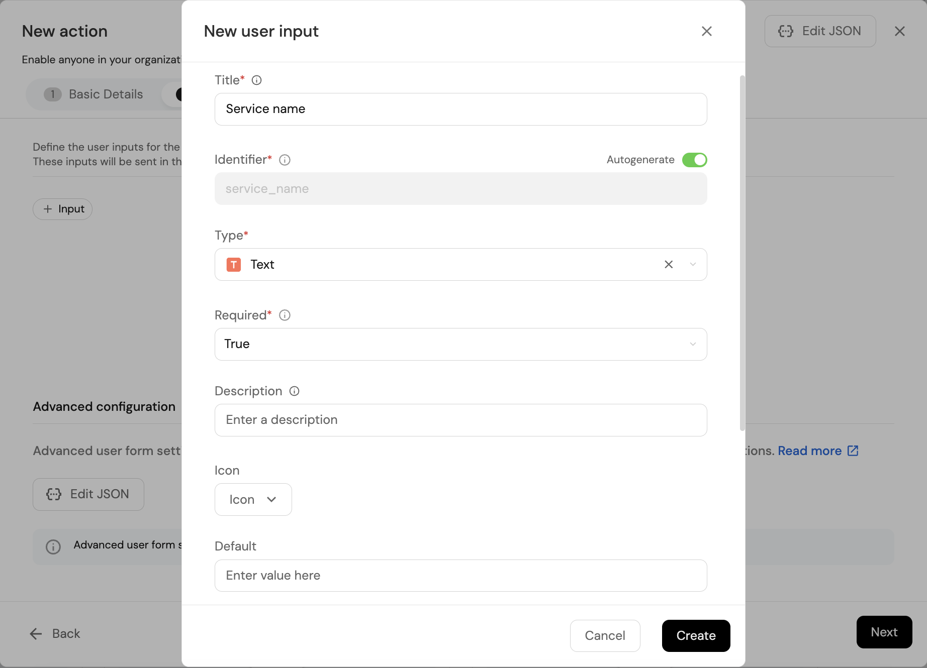This is where you can define which data will be sent to your backend each time the action is executed.For this example, we will send some details that our backend needs to know, including the service name and the id of the action run.