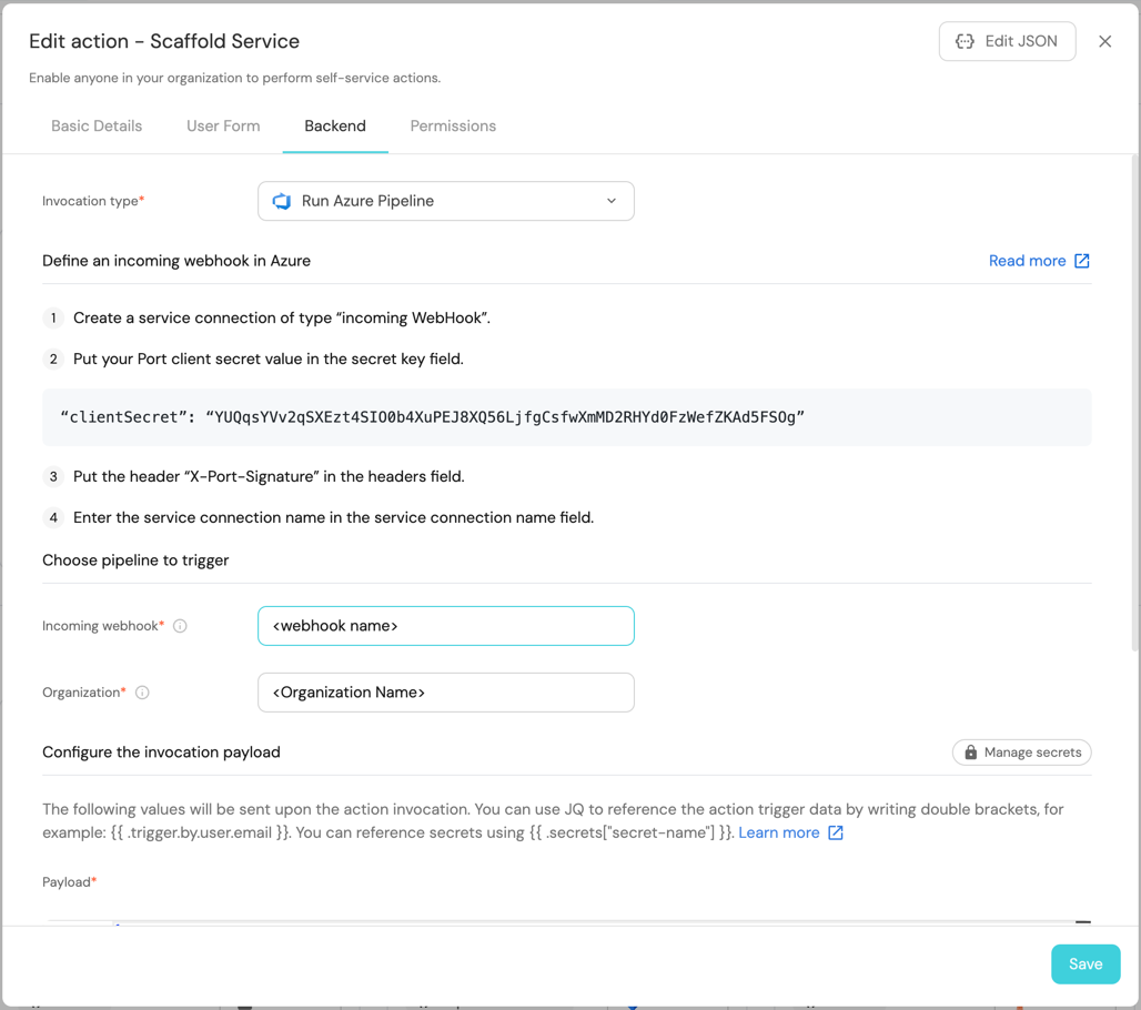Now we'll define the backend of the action. Port supports multiple invocation types, depending on the Git provider you are using.