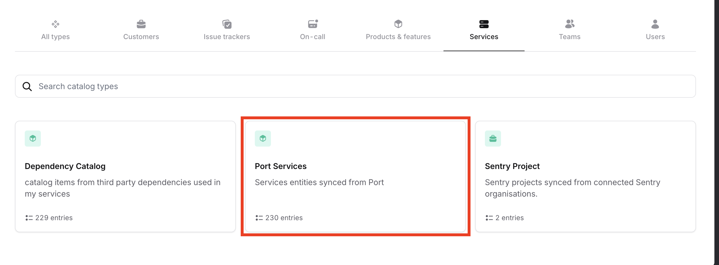 catalog type or any custom name you provided. - You should now see the synced service entities from Port listed under this catalog type, giving you improved visibility and context for managing incidents.